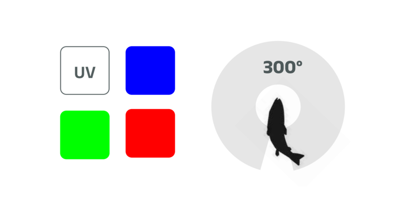 - Fish: Near-panoramic (~300°), underwater adaptation